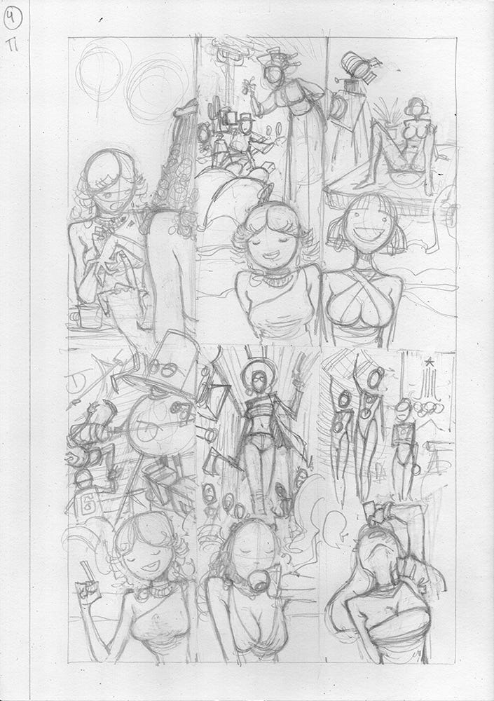 that demonstrate the instinct of a great cartoonist: every character needs to be recognizable at a glance. These are all women around a table, so faces, hair, and dress needs to be distinct. Notice how the types of tops vary? More important than you think!And check this out:
